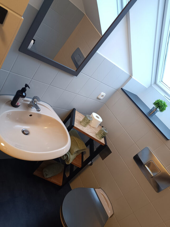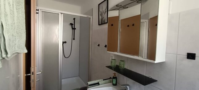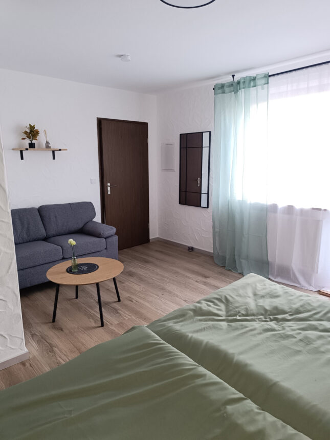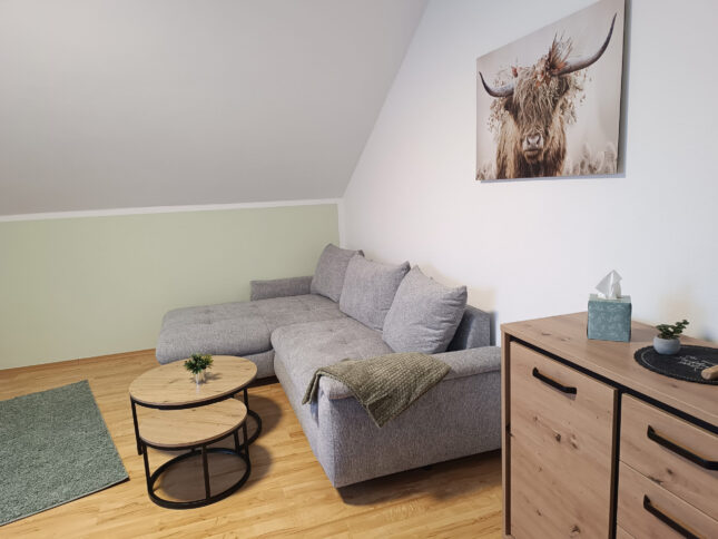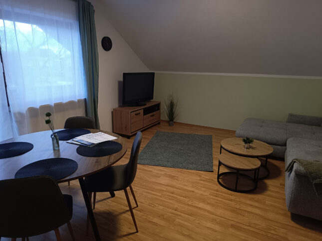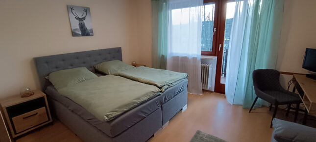 Unsere gemütlich eingerichtete Ferienwohnung mit 56 m² Wohnfläche befindet sich im 1.Stock unserer Pension und bietet Platz für 2 Personen. Die komplett ausgestattete Kochnische mit Geschirrspüler, Kühlschrank, Herd, Backofen, Wasserkocher, Kaffeemaschine und einer Grundausstattung an Geschirr, Gläser und Besteck lässt keine Wünsche offen. Im Wohnbereich befinden sich ein Esstisch, eine Schlafcouch und ein TV mit SAT-Empfang und Zugang zum Balkon mit einem herrlichen Blick ins Grüne. Die Ferienwohnung hat ein Schlafzimmer mit einem Doppelbett und einem Kleiderschrank. Das Badezimmer verfügt eine Dusche und ein WC. Bettwäsche, Handtücher, kostenfreie WLAN-Nutzung, Parkplatz und Endreinigung sind im Preis enthalten. Bitte beachten Sie, dass Haustiere nur nach Absprache erlaubt sind.