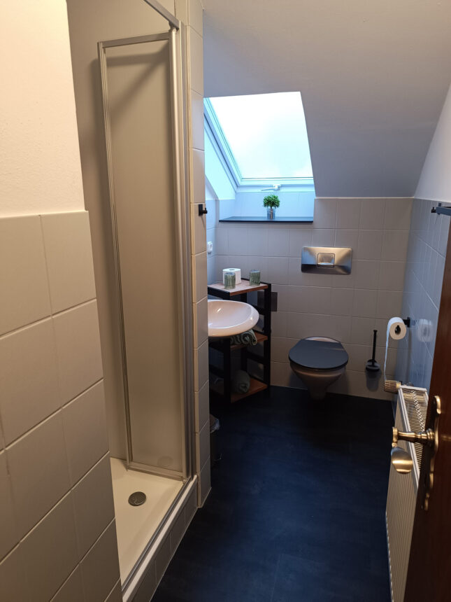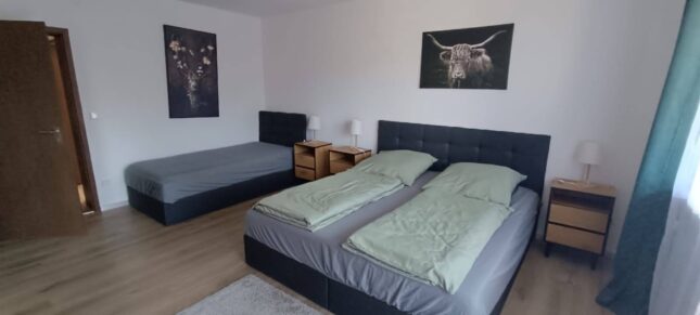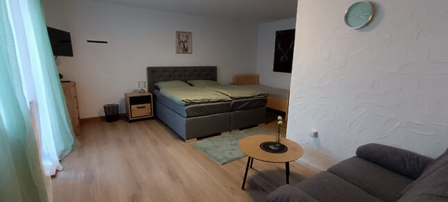 Diese gemütlich eingerichtete Ferienwohnung mit 63 m² Wohnfläche befindet sich im EG unserer Pension und bietet Platz für 2-4 Personen. Die komplett ausgestattete Küche mit Essecke, Geschirrspüler, Kühlschrank, Herd, Backofen, Wasserkocher, Toaster, Kaffeemaschine und einer Grundausstattung an Geschirr, Gläser und Besteck lässt keine Wünsche offen. Im Wohnbereich befindet eine Schlafcouch, TV mit SAT-Empfang und Zugang zum Balkon mit einem herrlichen Blick ins Grüne. Die Ferienwohnung verfügt über ein Schlafzimmer mit einem Doppelbett und zwei Einzelbetten. Weitere Gäste finden auf dem bequemen Schlafsofa im Wohnbereich Platz. Das Badezimmer bietet eine Dusche und ein WC. Bettwäsche, Handtücher, kostenfreie WLAN-Nutzung, Parkplatz und Endreinigung sind im Preis enthalten. Bitte beachten Sie, dass Haustiere nur nach Absprache erlaubt sind.